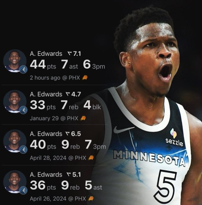 據(jù)統(tǒng)計(jì),過去4場和太陽的交手(含2場季后賽),愛德華茲場均38.3分7.5板5.8助,進(jìn)4.3記三分,三項(xiàng)命中率55/43/91%。