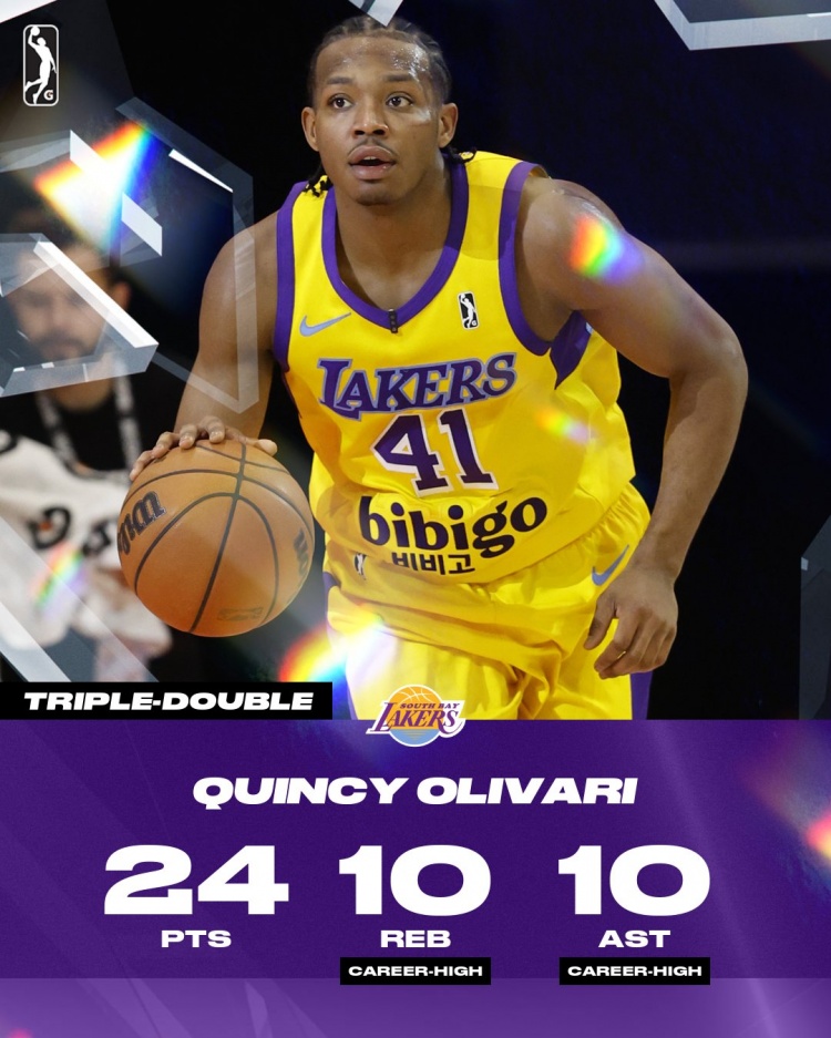 南灣湖人球員奧利瓦里表現(xiàn)亮眼拿下生涯首個(gè)三雙,他全場(chǎng)出戰(zhàn)38分鐘,13投6中,三分11投4中,罰球3中3,拿下24分10籃板10助攻,籃板助攻均為生涯新高,正負(fù)值高達(dá)+25。