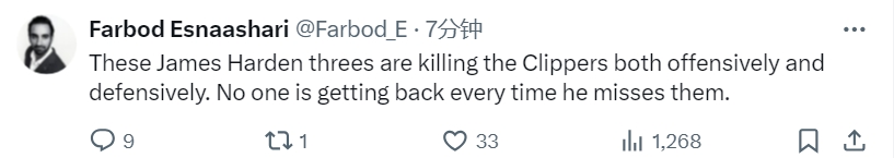 船記Farbod Esnaashari發(fā)推:“哈登這些三分球在攻防兩端都在殺死快船,當他打鐵的時候,每個人都退不回來?!?/p>