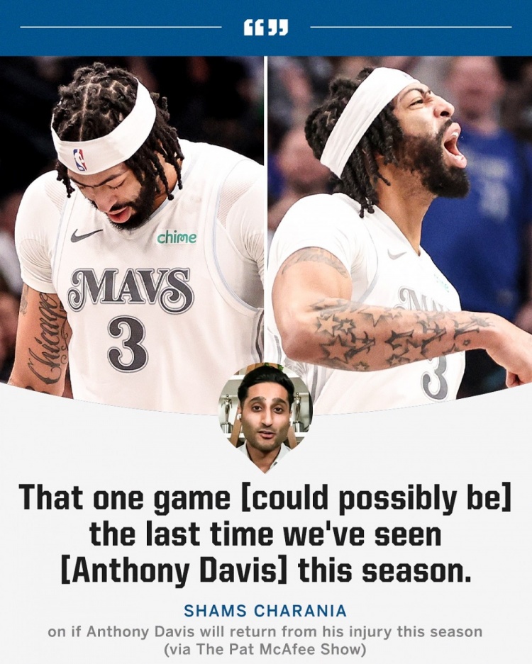 名記Shams在播客節(jié)目中也談到了獨行俠另一位球星安東尼-戴維斯的情況:“安東尼-戴維斯自獨行俠首秀以來就一直缺陣,我認為他和他的經(jīng)紀團隊會進行商討,并且會有一些非常艱難的對話,不能排除這樣的可能性——那場比賽可能是我們本賽季最后一次看到安東尼-戴維斯出戰(zhàn)。”