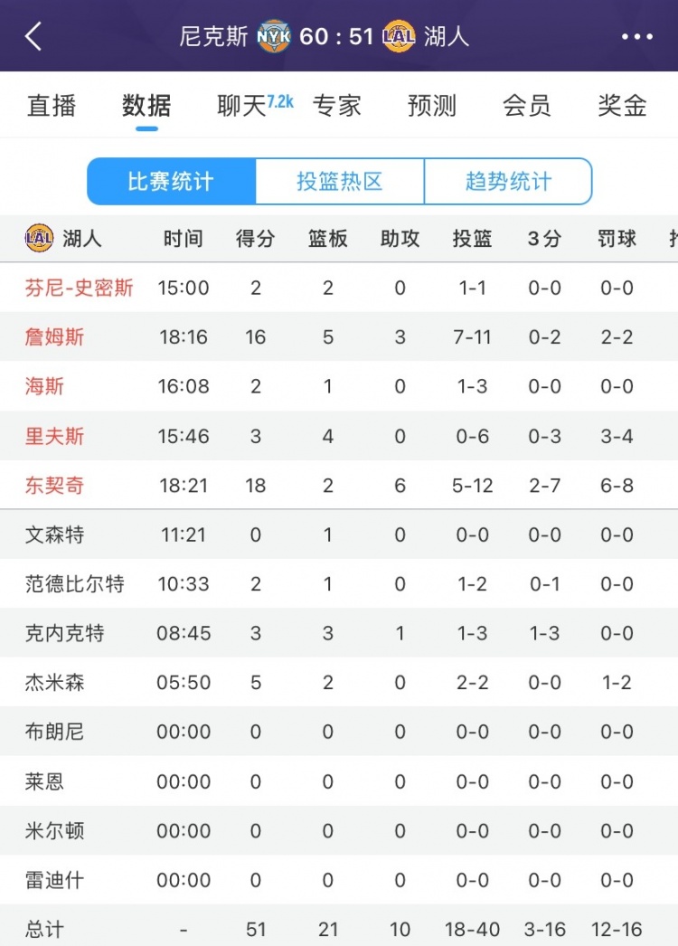 3月7日訊 NBA常規(guī)賽,湖人半場(chǎng)51-60落后尼克斯。