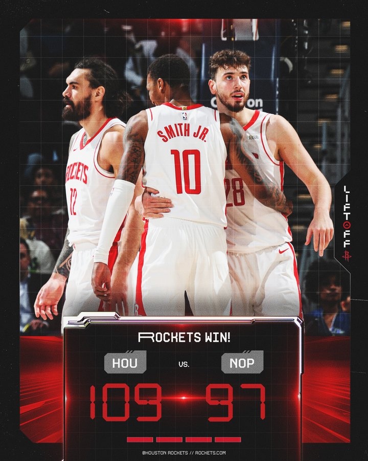 賽后,火箭官方曬出本場贏球海報,申京、亞當斯和小賈巴里登上封面。