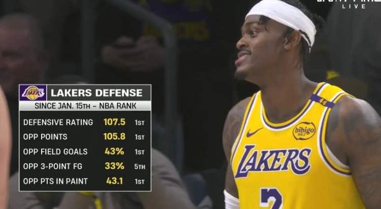 1月15日至今,湖人防守效率值107.5 ,聯(lián)盟第1;限制對手場均得分105.8分 ,聯(lián)盟第1;限制對手投籃命中率43% ,聯(lián)盟第1;限制對手三分球命中率33% ,聯(lián)盟第5;限制對手禁區(qū)得分43.1分 ,聯(lián)盟第1。