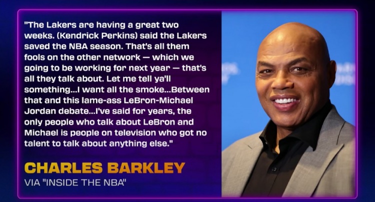 他說:“湖人隊在過去兩周的表現非常出色,而帕金斯說湖人隊拯救了NBA賽季。另一家媒體(ESPN)的那些蠢貨——我們明年就要為他們工作了,他們整天就聊這些。我跟你們說,我可不怕爭議。除了這個,還有勒布朗和邁克爾-喬丹誰更厲害這種無聊的爭論。我都說了好幾年了,只有那些在電視上沒別的話題可聊的人才會談論勒布朗和邁克爾 。”