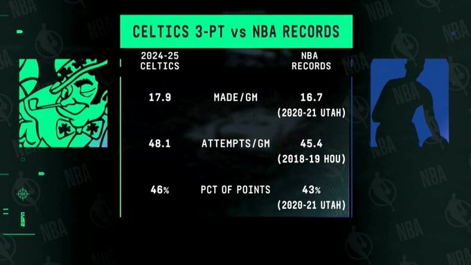 轉(zhuǎn)播方曬出一組本賽季凱爾特人和NBA歷史三分數(shù)據(jù)的對比: