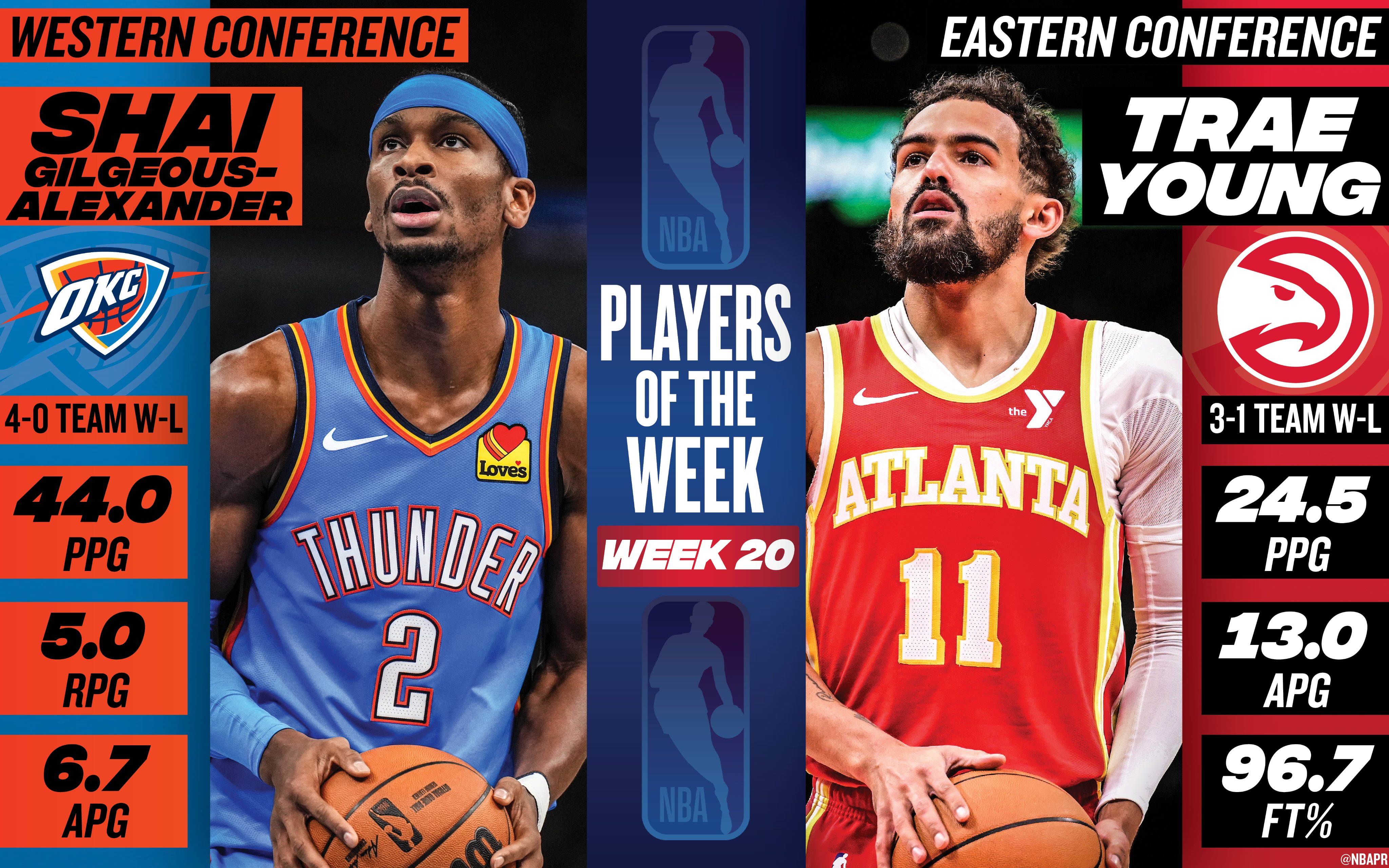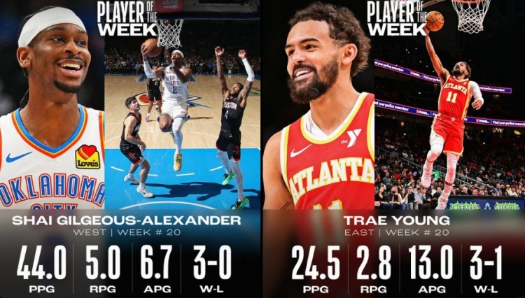 3月11日訊 今日NBA官方宣布,老鷹后衛(wèi)特雷-楊和雷霆后衛(wèi)亞歷山大分別被評為2024-25賽季第20周東西部周最佳球員。