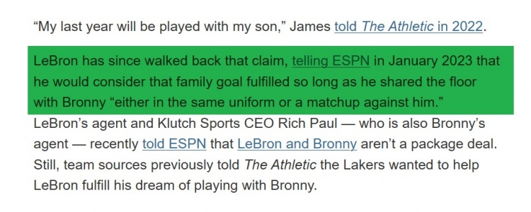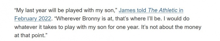 2022年2月,詹姆斯在接受The Athletic采訪時第一次談到父子同臺的愿望:“我在生涯最后一年會和我兒子一起打球,無論布朗尼在哪里,我都會去那個地方。我愿意做任何事情來實現(xiàn)與我的兒子一起打球一年。屆時錢也就不重要了。”