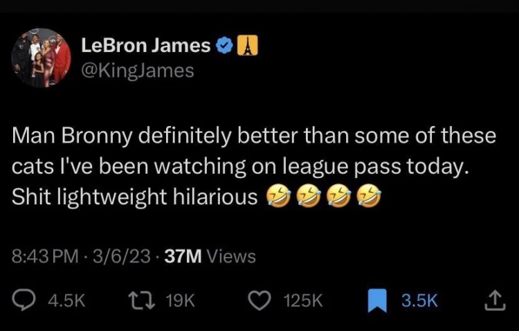 在2023年3月6日,詹姆斯發(fā)推寫道:“天啊,布朗尼絕對強于今天我在聯(lián)盟通(注:NBA官方比賽直播服務(wù))上看到的一些阿貓阿狗。這場面真的有點好笑????????????????”
