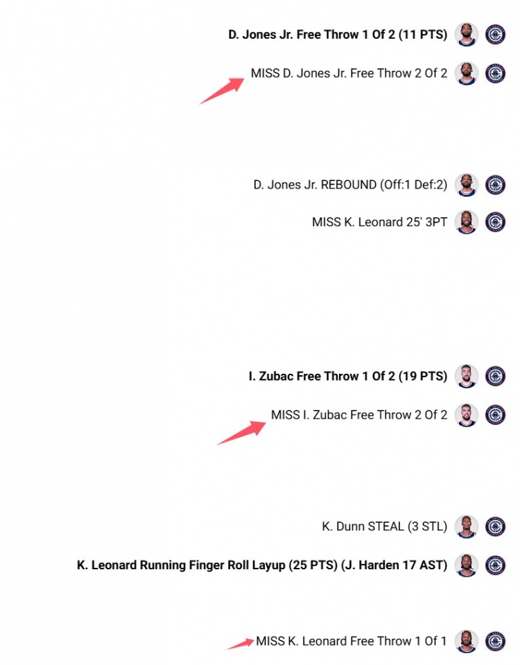 在比賽的最后2分33秒至1分15秒的決勝時(shí)刻,瓊斯、祖巴茨分別兩罰一中,小卡罰丟加罰,一共3次罰球打鐵。