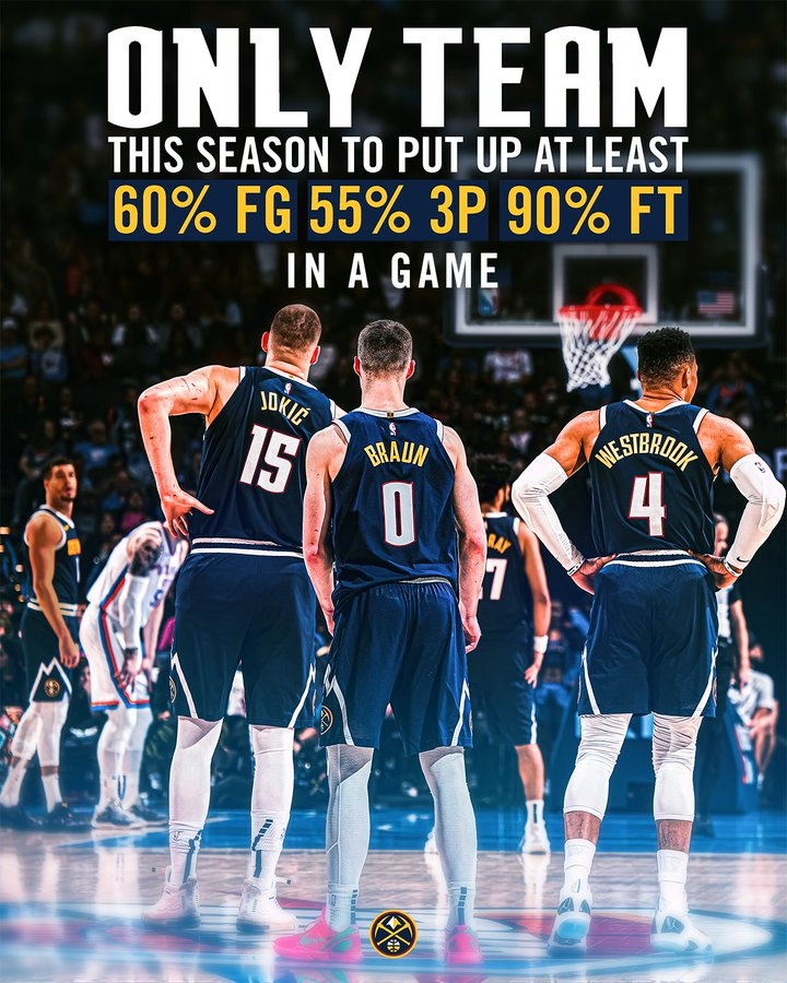 據(jù)統(tǒng)計,掘金是本賽季首支球隊在一場比賽中打出60-55-90%的命中率。而且掘金打的是聯(lián)盟第一防守的雷霆。