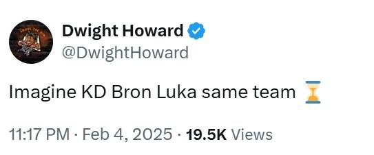 2月4日訊 今天,前NBA球員德懷特-霍華德更推道:“想象一下杜蘭特、勒布朗和東契奇在一支球隊???!?/p>