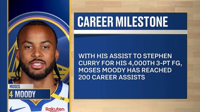 比賽第三節(jié),穆迪助攻庫(kù)里命中本場(chǎng)第2記三分,后者正式突破4000記三分神級(jí)大關(guān),而這也是穆迪生涯的第200次助攻!