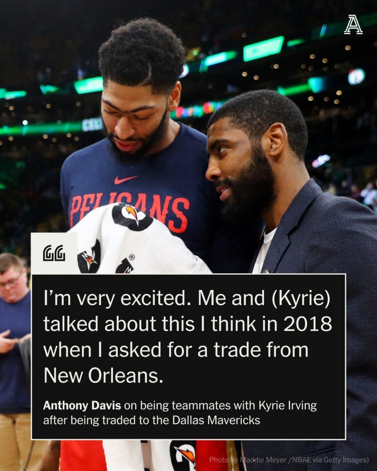 談到和歐文搭檔,濃眉說道:“我感覺很興奮。我2018年在鵜鶘申請交易的時候就和歐文談?wù)撨^這件事。我們一直想一起打球?,F(xiàn)在我們有機會這樣做了。”