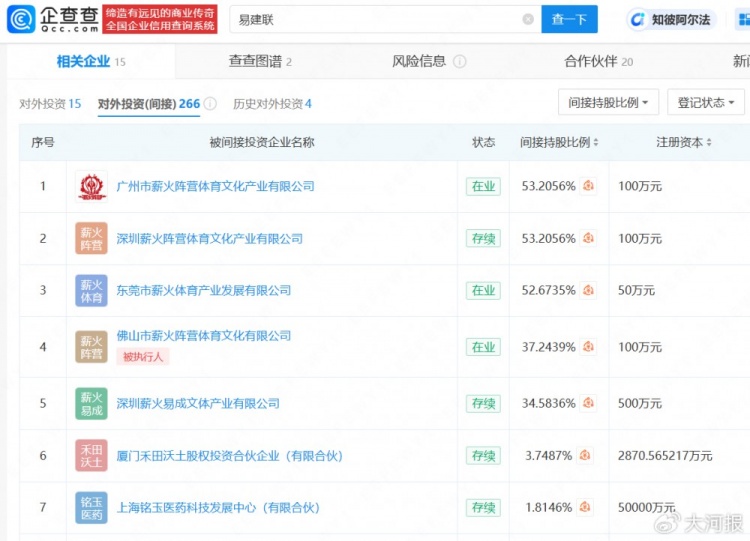 企查查APP顯示,易建聯(lián)關聯(lián)15家企業(yè),其中12家為存續(xù)狀態(tài),包括薪火陣營文體教育(深圳)集團有限公司、上海壹球成名信息技術有限公司等。此外,易建聯(lián)間接持股企業(yè)超200家,行業(yè)涉及除體育文化外,還包括商貿(mào)、科技、投資等領域。今年2月,易建聯(lián)關聯(lián)企業(yè)佛山市薪火陣營體育文化有限公司成被執(zhí)行人,執(zhí)行標的約12萬元。