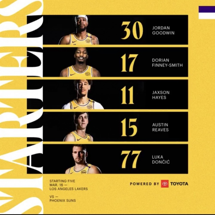 3月17日訊 今日,湖人官方賽前公布了本場比賽的首發(fā)陣容。東契奇、里夫斯、古德溫、芬尼-史密斯、海斯將首發(fā)出場。湖人將于3:30主場迎戰(zhàn)太陽。 標(biāo)簽: 籃球 NBA 湖人