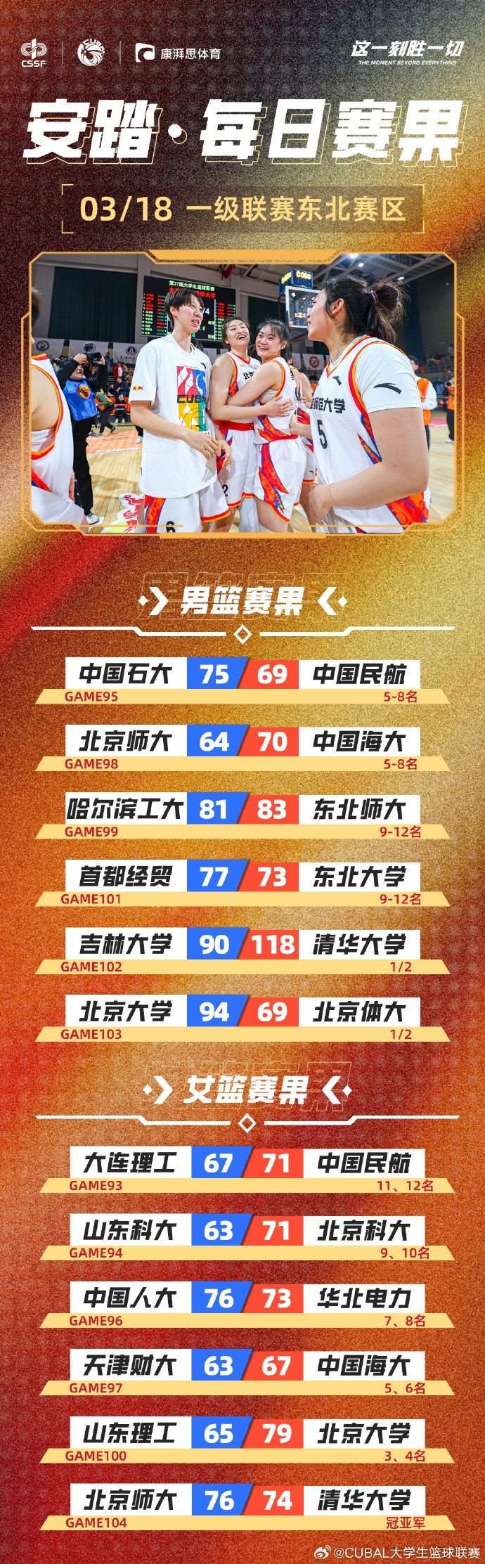 男籃方面,清華北大再次會師決賽。女籃方面,北京師大雙加時險勝清華大學,時隔三年再次拿回東北王的寶座!