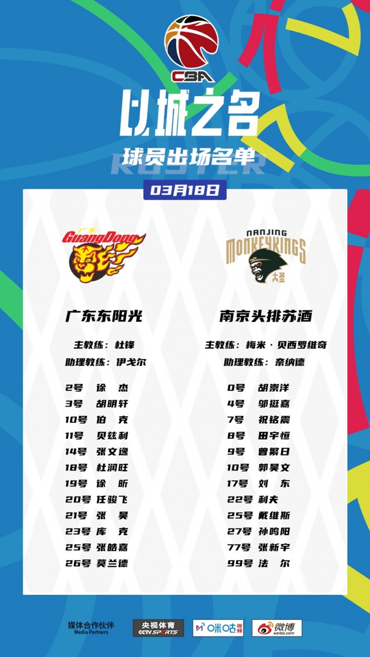 廣東大名單:徐杰、胡明軒、伯克、貝茲利、張文逸、杜潤旺、徐昕、任駿飛、張昊、庫克、張皓嘉、莫蘭德