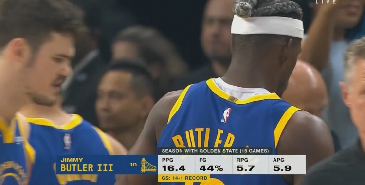 巴特勒?qǐng)鼍?6.4分5.7板5.9助,命中率44%,勇士期間戰(zhàn)績(jī)14勝1負(fù)