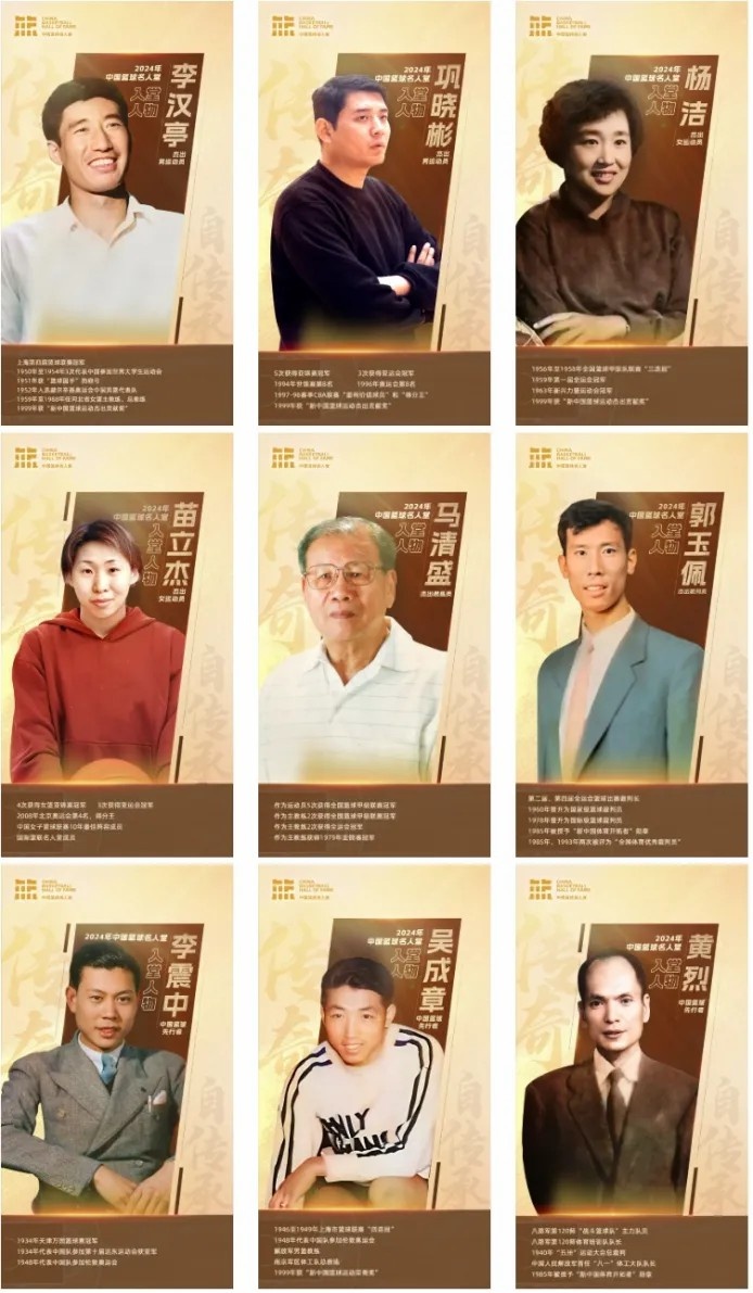 2024年中國(guó)籃球名人堂共產(chǎn)生9位入堂人物,杰出男運(yùn)動(dòng)員為:李漢亭、鞏曉彬;杰出女運(yùn)動(dòng)員為:楊潔、苗立杰;杰出教練員為:馬清盛;杰出裁判員為:郭玉佩;中國(guó)籃球先行者為:李震中、吳成章、黃烈。
