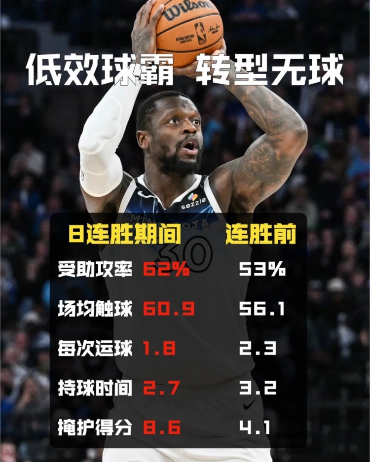 開啟連勝期間,蘭德爾提升了持球的效率,他平均每場比賽可以送出5.8次助攻,5.8/2.9的助攻失誤比,遠(yuǎn)比連勝之前的4.4/2.8好得多。