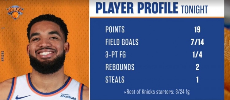 半場比賽,尼克斯首發(fā)除了唐斯以外都表現(xiàn)不佳,投籃共計24中3,共得到11分。