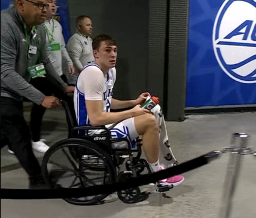 3月14日,ACC分區(qū)錦標(biāo)賽1/4決賽,杜克大學(xué)對陣佐治亞理工學(xué)院上半場,弗拉格在搶籃板落地時踩到對手恩東戈的腳上扭傷腳踝,他起身后被攙扶著走到場邊,之后坐著輪椅離場,在接受檢查之后自行走回球隊替補(bǔ)席,下半場沒有出戰(zhàn)。
