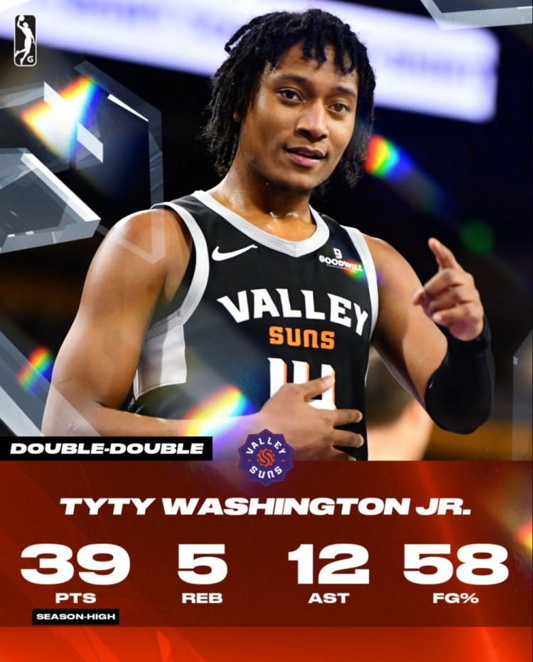 此役,前火箭球員小泰泰-華盛頓(效力于山谷太陽、太陽下屬G聯(lián)盟球隊)出戰(zhàn)36分7秒,投籃26中15,三分9中4,罰球4中3,爆砍39分5籃板12助攻2搶斷。
