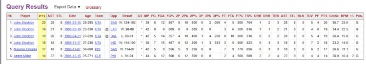 在NBA歷史上,只有三名球員在送出17次助攻的同時送出8次搶斷,分別是斯托克頓(4次),奇克斯(1次)、安德烈-米勒(1次)。