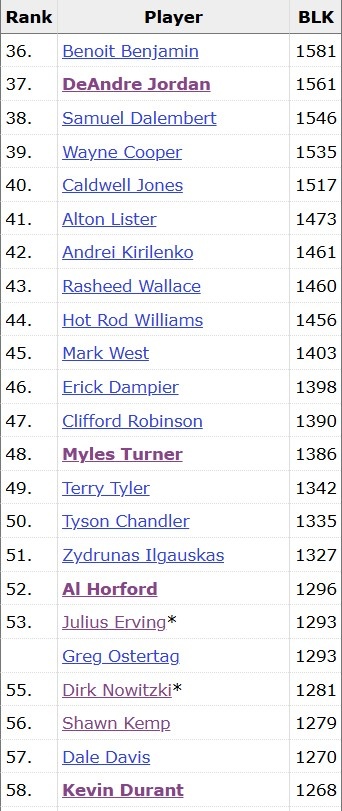 本場比賽過后,杜蘭特的常規(guī)賽生涯蓋帽總數來到1271次,超越戴爾-戴維斯,上升至NBA歷史第57位。