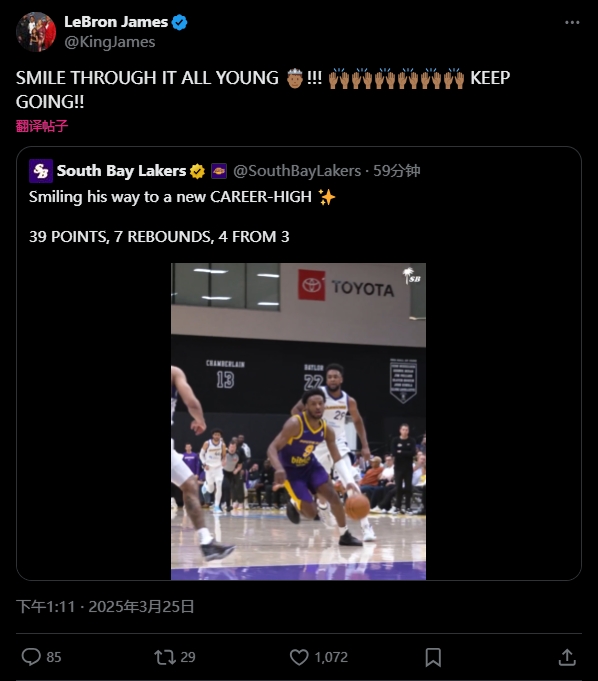 賽后,詹姆斯轉發(fā)了布朗尼的賽場集錦并寫道:“保持微笑,繼續(xù)前進,年輕的王子!加油!”