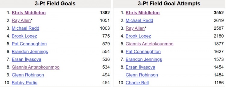 據(jù)統(tǒng)計(jì),米德爾頓在雄鹿生涯三分出手3552次,命中1382記,都是隊(duì)史紀(jì)錄。