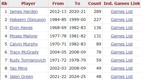 據(jù)統(tǒng)計,這是杰倫-格林生涯第49場比賽30+,追平姚明,并列火箭隊史第8位。