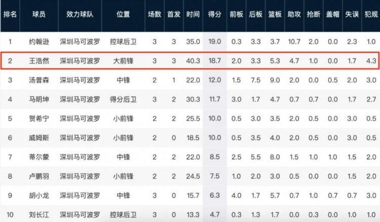 戲份增加的王浩然,產(chǎn)量也無愧于教練組的信任——他場均18.7分僅次于小外援約翰遜的19分,作為本土隊內(nèi)得分王的同時,另外也有隊內(nèi)第4的5.3籃板,和第2的4.7次助攻。