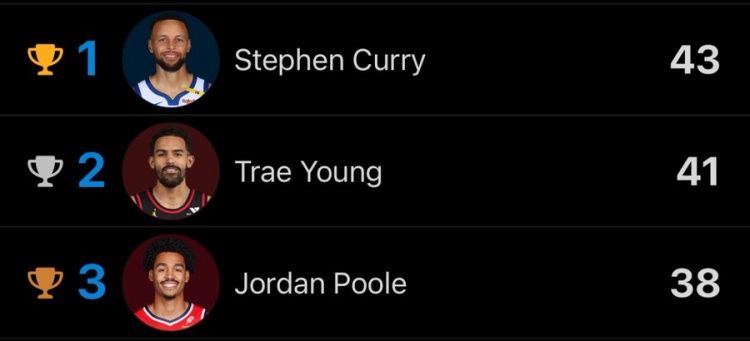 本賽季命中30+英尺投籃球員前3名:庫(kù)里43記 特雷-楊41 普爾38