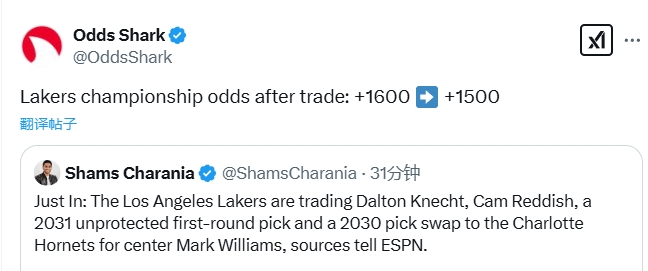 博彩網(wǎng)站Odds Shark轉(zhuǎn)發(fā)了這則消息,并寫道:“湖人冠軍賠率從+1600(押100若中連本帶利返1700)變?yōu)?1500(押100若中連本帶利返1600)?!?/p>