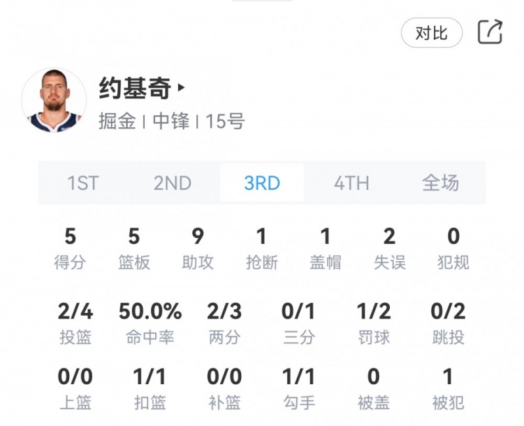 第三節(jié),掘金核心約基奇穿針引線(xiàn),單節(jié)送出9次助攻,三節(jié)打完約基奇砍下28分10籃板12助攻2搶斷。