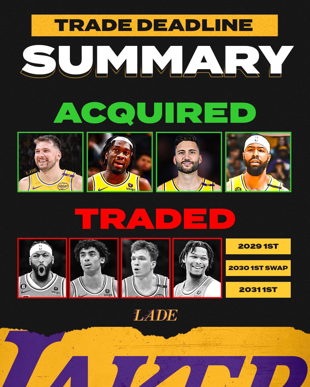 送出:拉塞爾、劉易斯、濃眉、克里斯蒂、席菲諾、克內(nèi)克特、雷迪什;29年&31年首輪簽、25年&27年&30年&31年次輪簽;30年首輪互換權(quán)。