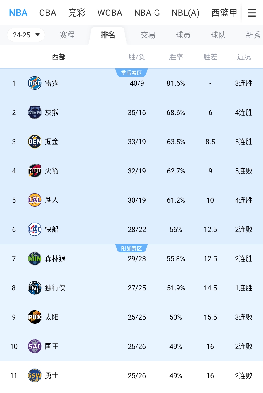 本場比賽過后,湖人對勇士完成三殺,目前30勝19負(fù)仍然位居西部第五名,距離第四的火箭僅有1個(gè)勝場,距離第三的掘金1.5個(gè)勝場。