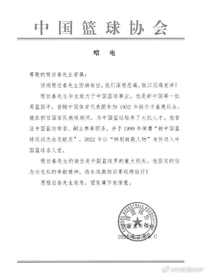 中國(guó)籃協(xié)前任副主席、原北京市體委副主任、新中國(guó)第一代國(guó)手程世春因病逝世,中國(guó)籃協(xié)向程世春協(xié)家屬發(fā)唁電慰問。