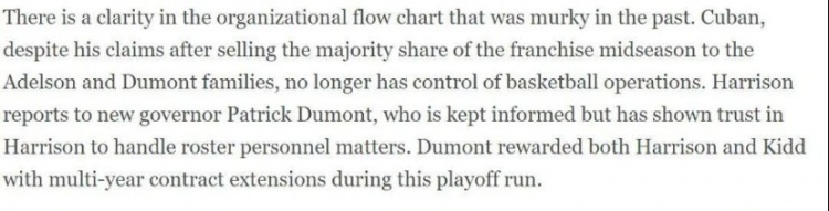 2024年6月底,選秀大會前夕,據(jù)ESPN的麥克馬洪報(bào)道,庫班已經(jīng)不再參與獨(dú)行俠隊(duì)的運(yùn)營工作,而由獨(dú)行俠隊(duì)的總經(jīng)理哈里森,直接向新老板杜蒙特匯報(bào)。