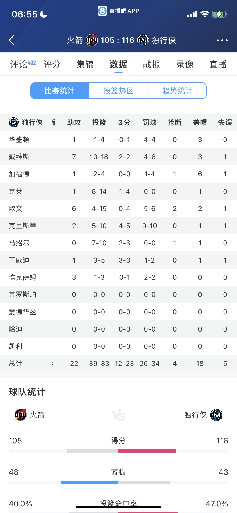 02月09日訊 NBA常規(guī)賽,獨(dú)行俠在主場(chǎng)以116-105拿下火箭,送給對(duì)手6連敗。