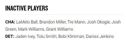 值得一提的是,黃蜂今天就有比賽,他們以102-112不敵活塞。馬威沒有被激活,缺席了本場比賽。