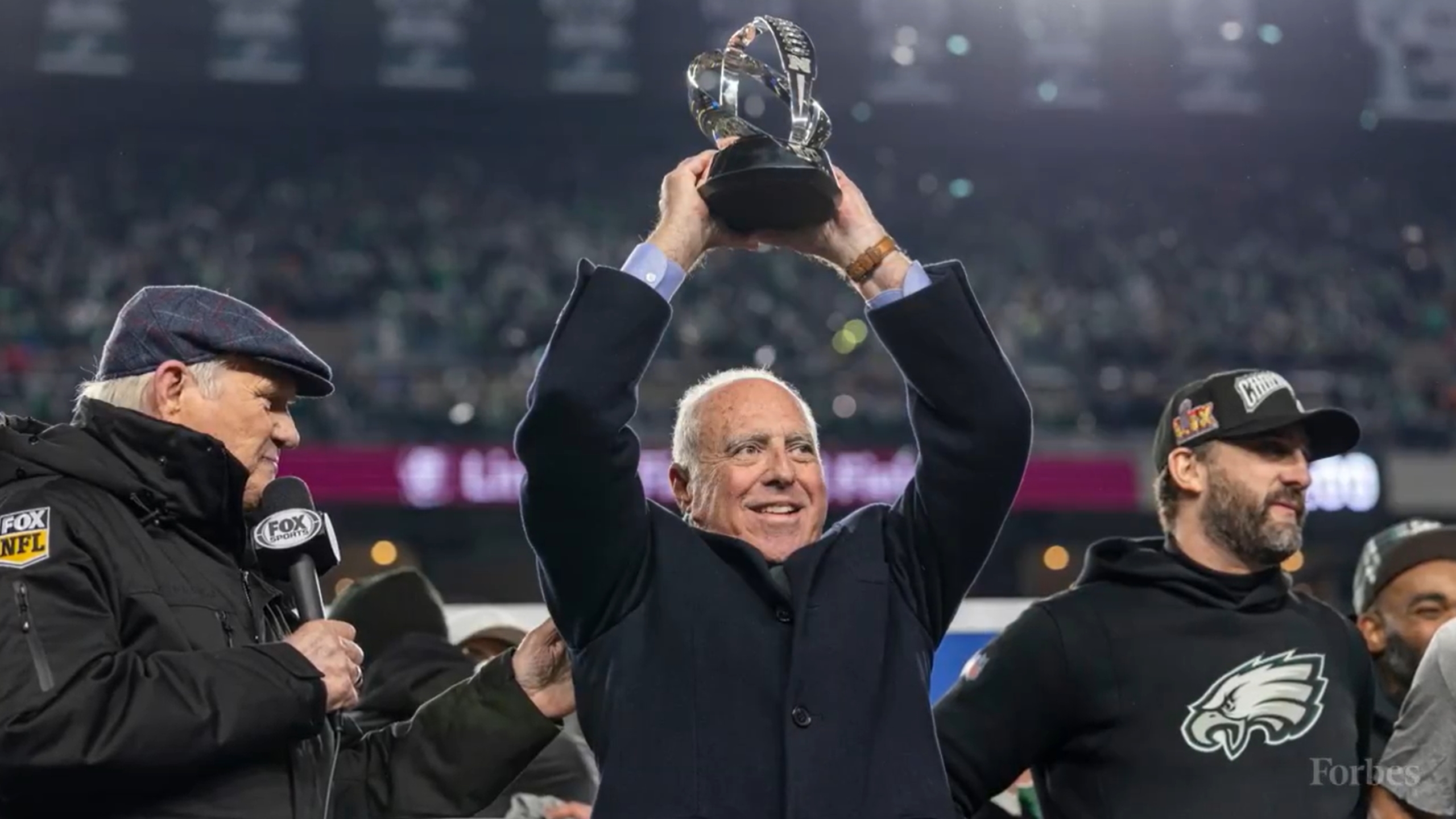 02月10日訊 費城老鷹40-22擊敗堪薩斯酋長,奪得隊史第二個超級碗冠軍。費城老鷹老板杰弗里-盧里現(xiàn)場觀戰(zhàn)并和球員一起慶祝奪冠。