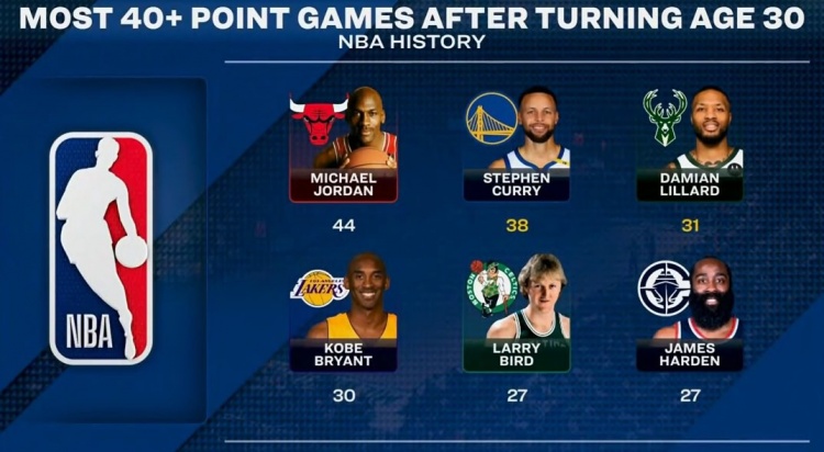 2月11日訊 今天NBA多場比賽進(jìn)行,轉(zhuǎn)播方曬出一組數(shù)據(jù),30歲以上球員砍下40+場次數(shù)的排行榜如下: