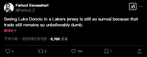 賽后,快船隊(duì)記Farbod Esnaashari發(fā)推寫道:“看到盧卡-東契奇身穿湖人球衣依然讓人感覺很不真實(shí),因?yàn)槟枪P交易是那么不可理喻!愚蠢?!?/span>