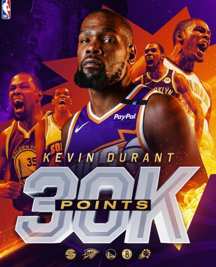 這是杜蘭特生涯第1101場(chǎng)比賽,在NBA歷史上,只有喬丹(960場(chǎng))和張伯倫(940場(chǎng))比他更快達(dá)成30000分成就。