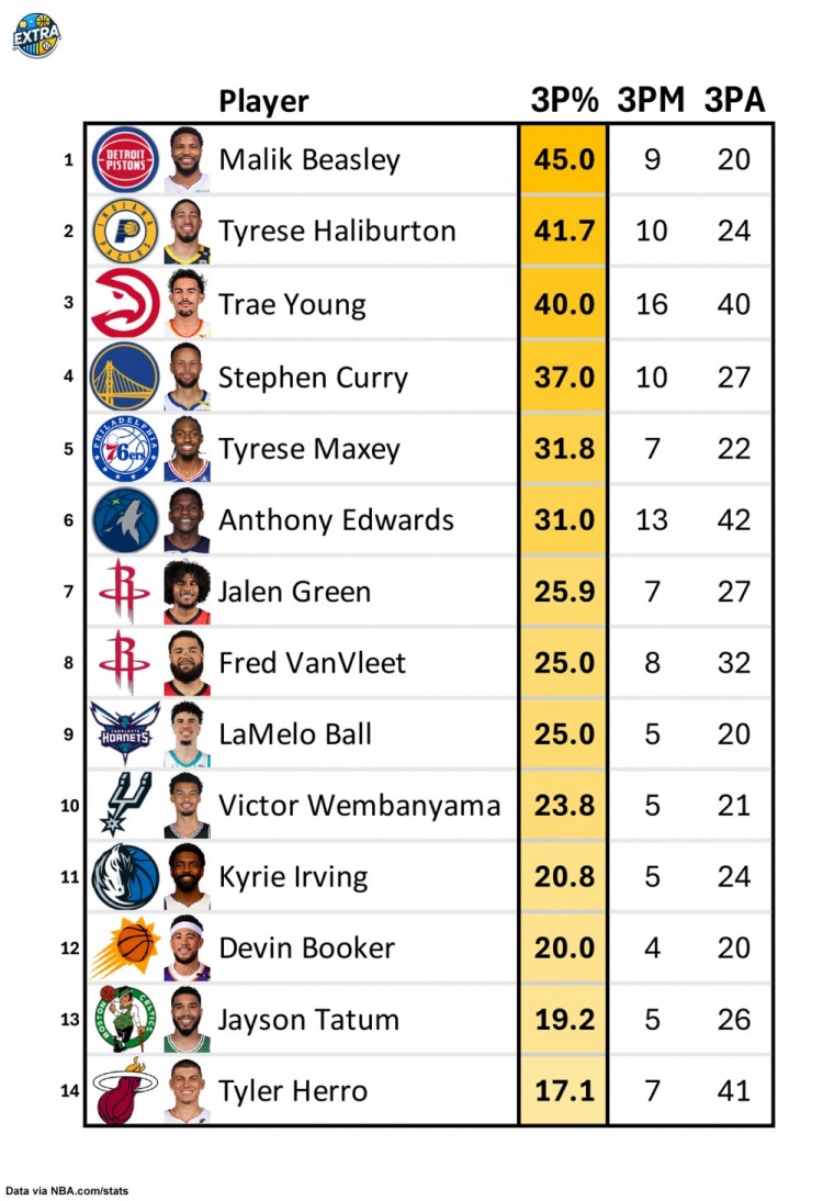 據(jù)統(tǒng)計(jì),本賽季共有14名球員在關(guān)鍵時(shí)刻(常規(guī)時(shí)間最后5分鐘或加時(shí)賽且分差不超過(guò)5分)出手了至少20記三分,這14人按命中率排名比斯利最準(zhǔn),庫(kù)里排第4,文班第10,具體如下圖: