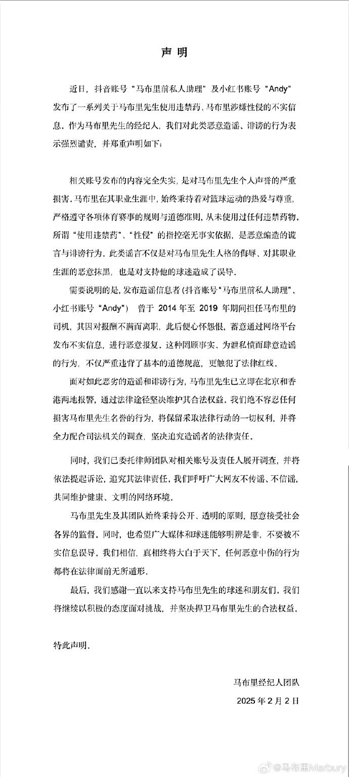 馬布里隨后通過個(gè)人微博發(fā)布了一篇其經(jīng)紀(jì)人團(tuán)隊(duì)撰寫的澄清信,證實(shí)了馬布里已報(bào)警的說法,并對“Andy”進(jìn)行了強(qiáng)烈譴責(zé),原文如下: