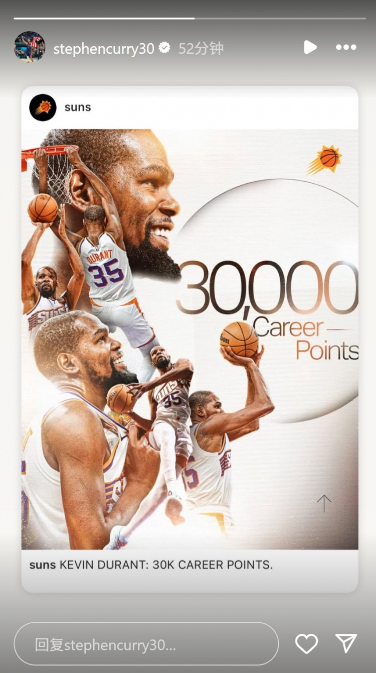 杜蘭特生涯總得分突破30000!庫里INS轉(zhuǎn)發(fā)相關(guān)動態(tài)