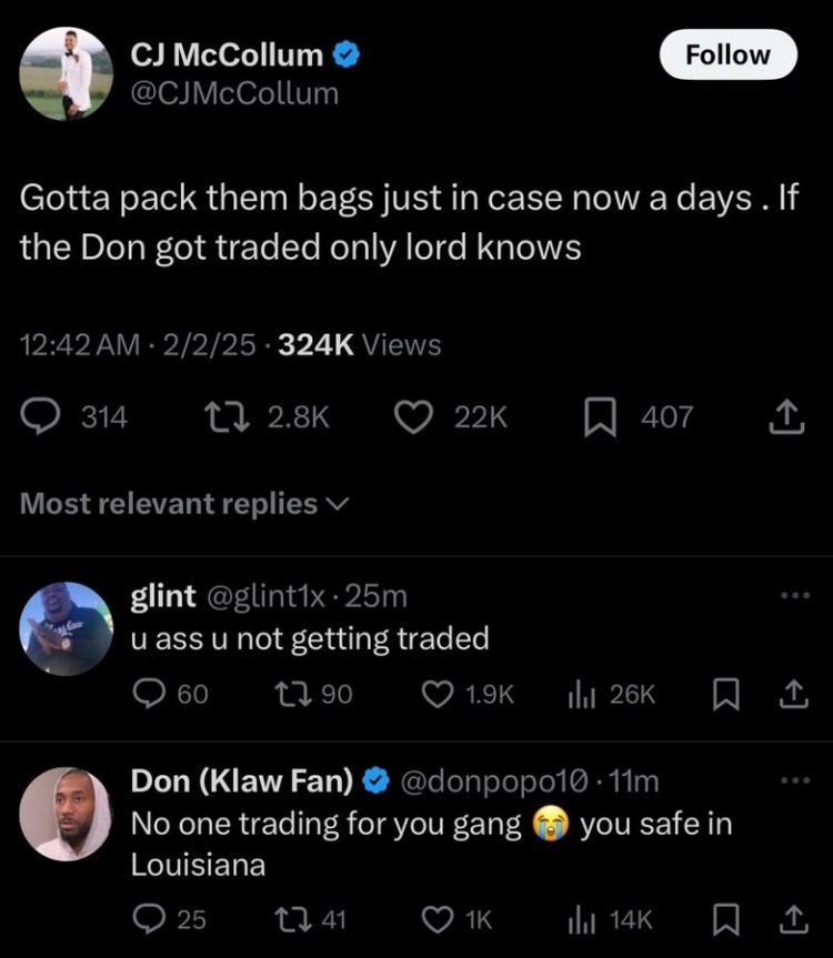 隨后,CJ-麥科勒姆更推道:“我得先把行李打包好,連東契奇都被交易了,天知道會發(fā)生什么。”